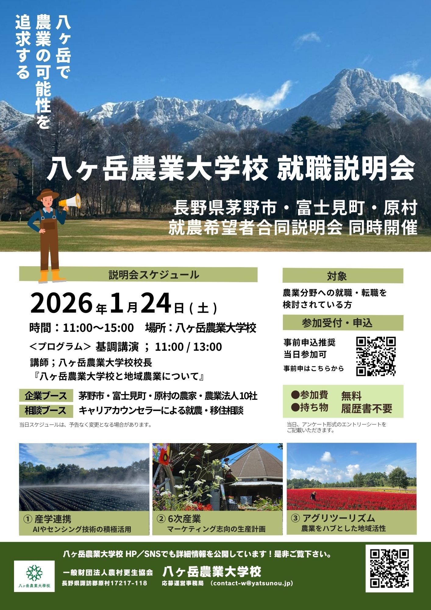 八ヶ岳農業大学校では、就農したい方、農業に興味がある方、また、大学校に就職したい方、移住を考えている方を対象に、就職説明会を開催します。