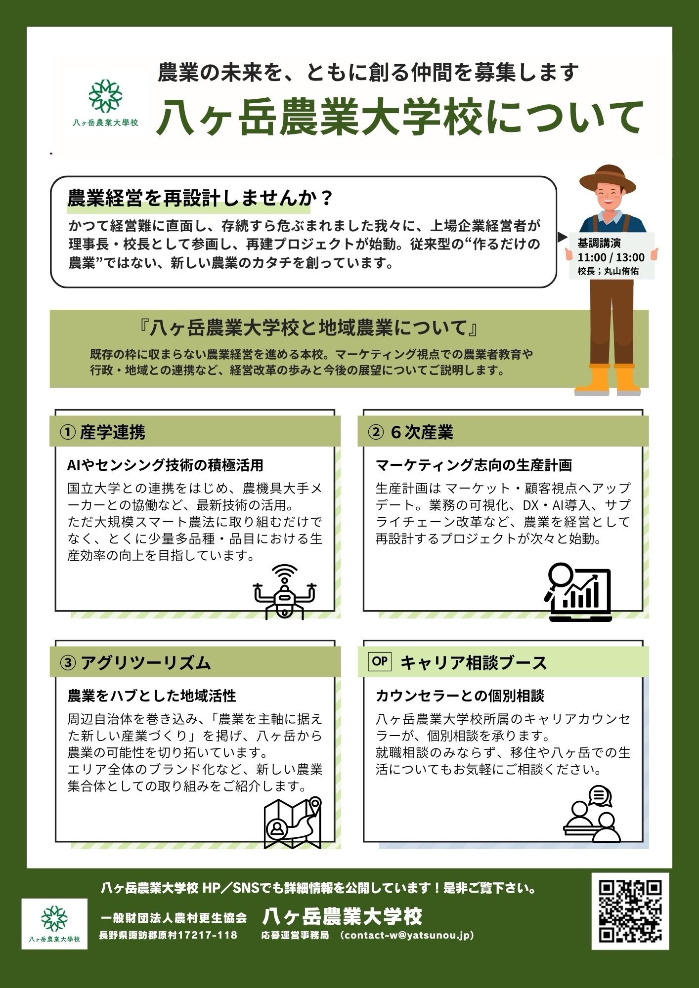 「八ケ岳中央農業実践大学校」のブースでは、「学校案内」「入学案内」「学校見学」等について説明いたます。